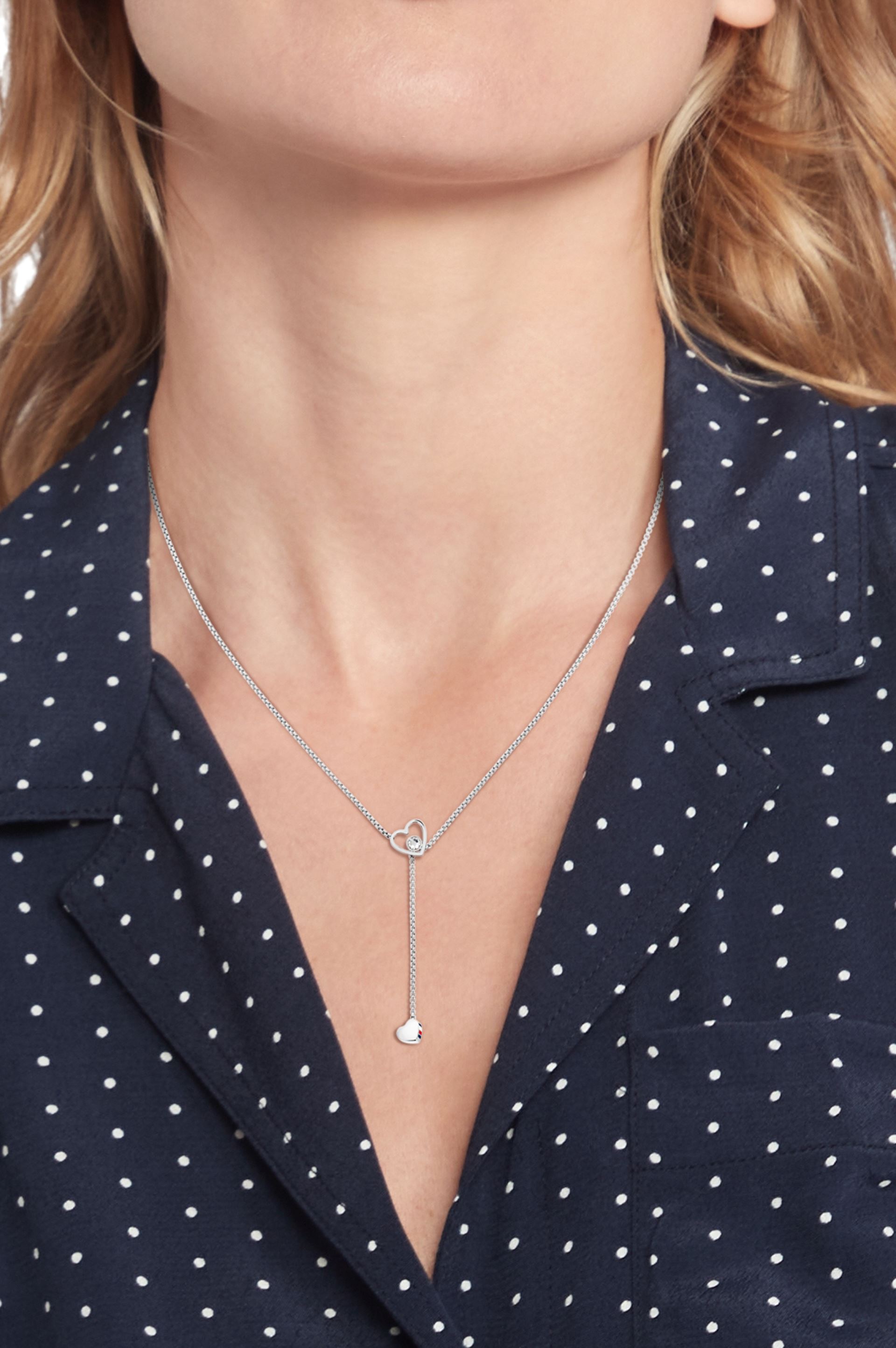 Moderní dámský náhrdelník z dílny značky Tommy Hilfiger, vyrobený z kvalitní oceli, ve tvaru "Y", zdobený dvěma srdíčky, větší srdíčko je zdobené drobným zirkonem, délka náhrdelníku: 45 cm, možnost prodloužení o 5 cm, zapínání formou oblíbené karabinky.