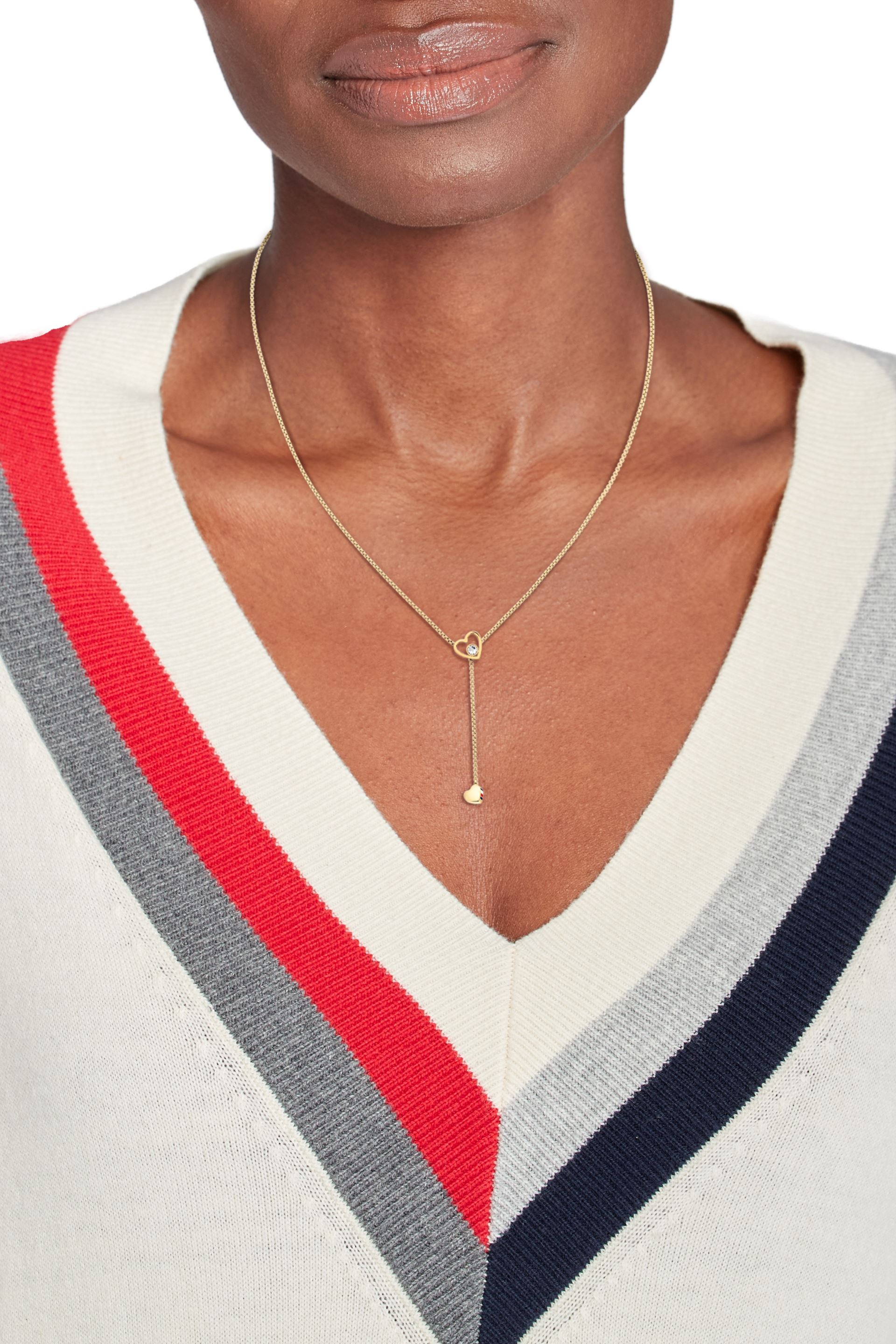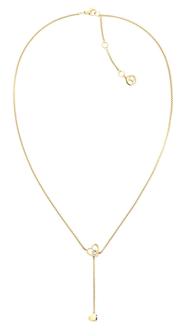 Moderní dámský náhrdelník z dílny značky Tommy Hilfiger, vyrobený z kvalitní pozlacené oceli, ve tvaru "Y", zdobený dvěma srdíčky, větší srdíčko je zdobené drobným zirkonem, délka náhrdelníku: 45 cm, možnost prodloužení o 5 cm, zapínání formou oblíbené karabinky.