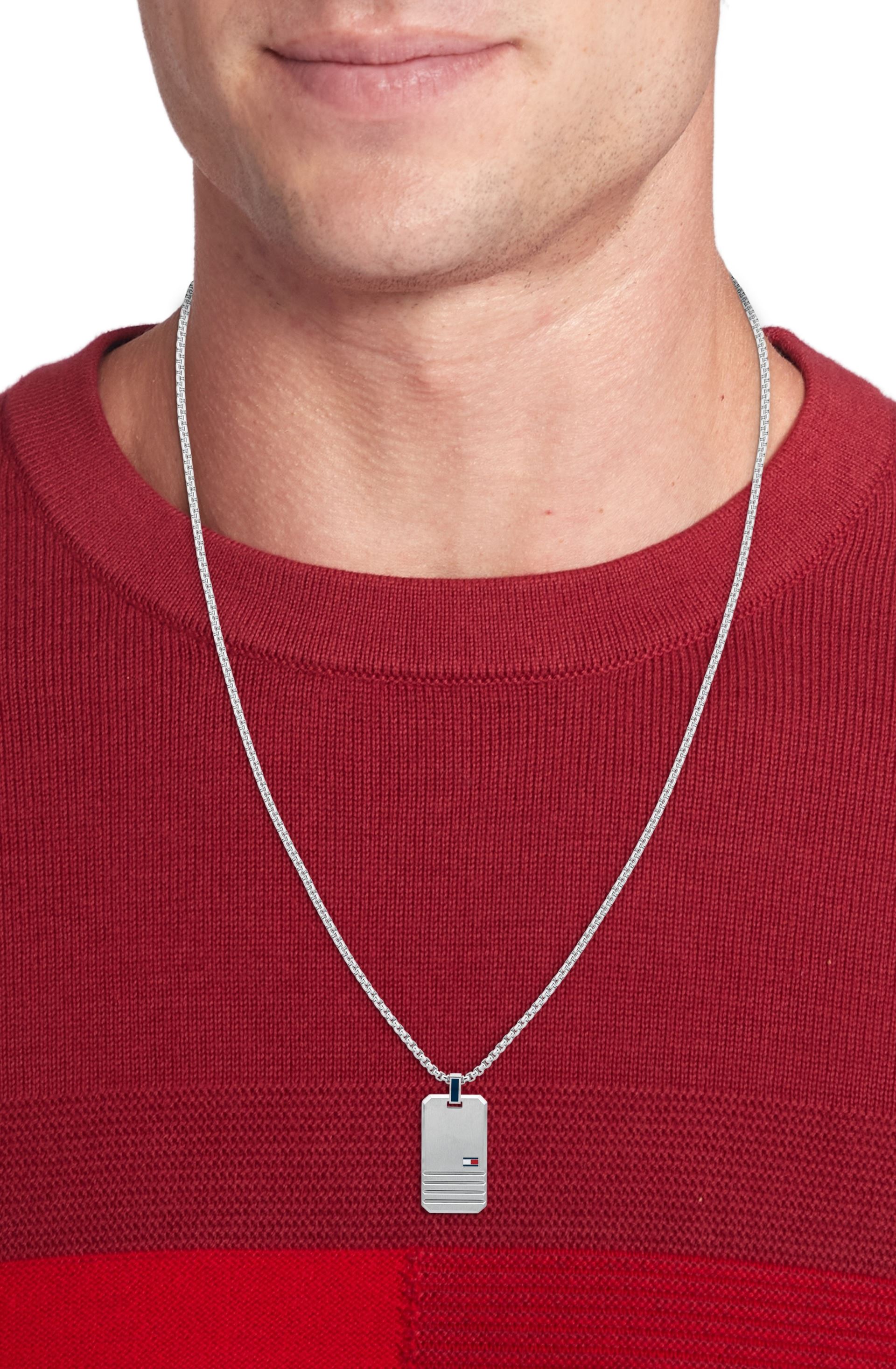 Stylový pánský náhrdelník od značky Tommy Hilfiger, vyrobený z kvalitní oceli, dekorovaný přívěskem ve tvaru vojenské známky, délka náhrdelníku: 60 cm, zapínání na klasickou karabinku zabraňuje ztrátě, nechybí název značky a oblíbená tricolora.