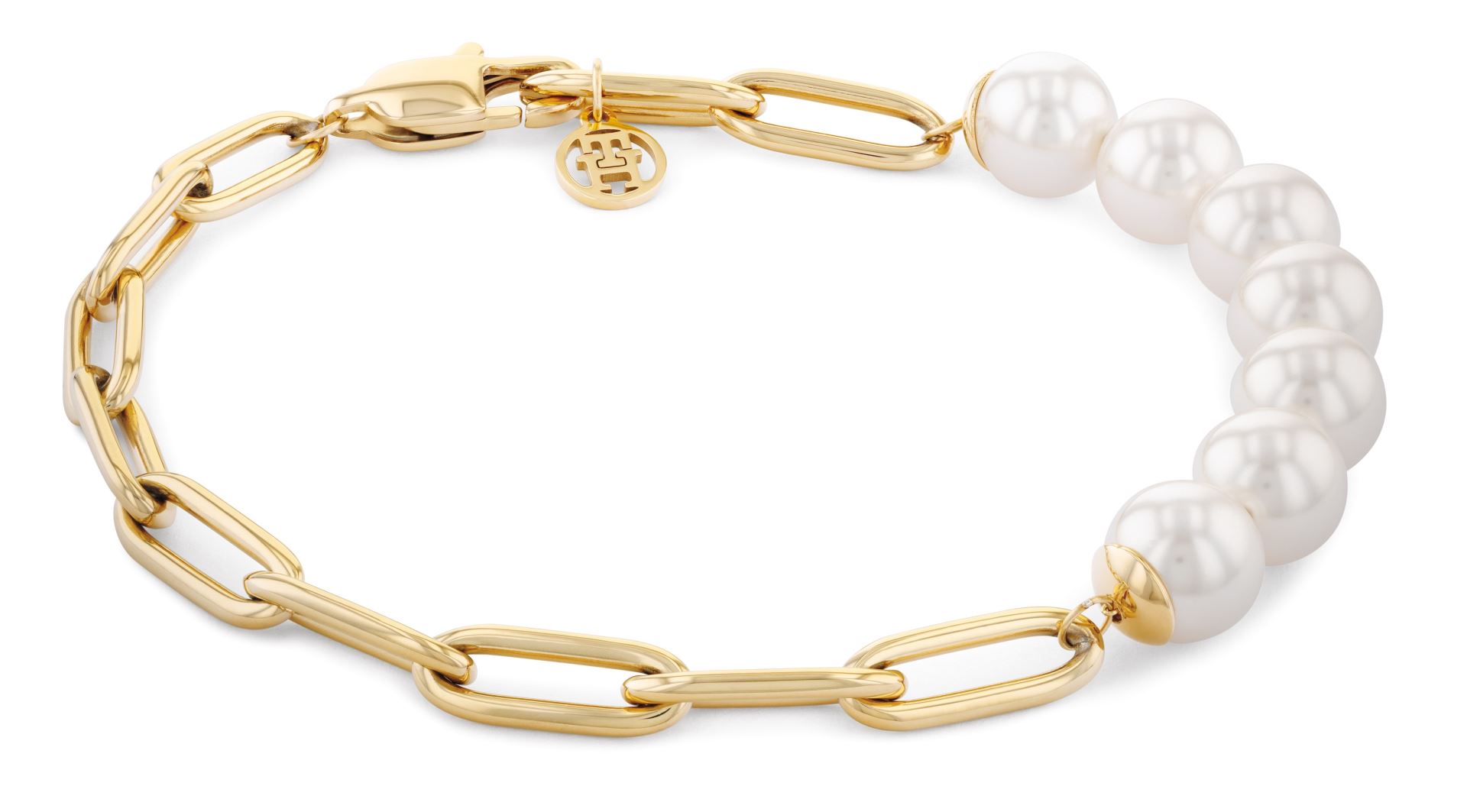 Elegantní dámský náramek z dílny značky Tommy Hilfiger vyrobený z vysoce kvalitní chirurgické oceli pozlacený žlutým zlatem a z části zdobený syntetickými perlami, oblíbený přívěsek s logem značky, délka náramku: 17 cm, zapínání na klasickou karabinku.