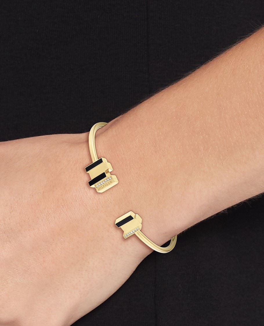 Fashion náramek pro ženy od značky Tommy Hilfiger, vyrobený z oceli, pozlacený tolik oblíbeným žlutým zlatem, díky zirkonům se hezky třpytí, nadčasový otevřený design si zaručeně oblíbíte, konec náramku dekoruje černý smalt, rozměry náramku: 6 x 5 cm.
