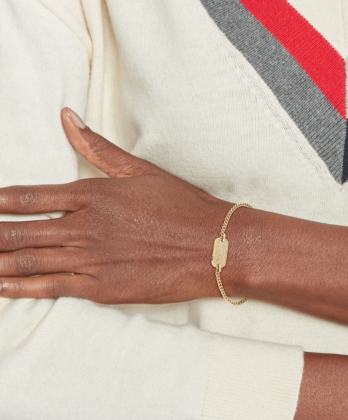 Módní náramek pro ženy značky Tommy Hilfiger, vyroben z kvalitní oceli, pokovený zlatým PVD povlakem, v nadčasovém designu, dekorovaný stylovou ozdobou s motivem psí známky, ozdoba je osazená třpytivými zirkonydélka náramku: 16 cm s možností prodloužení o 3 cm, zapínání na karabinku.