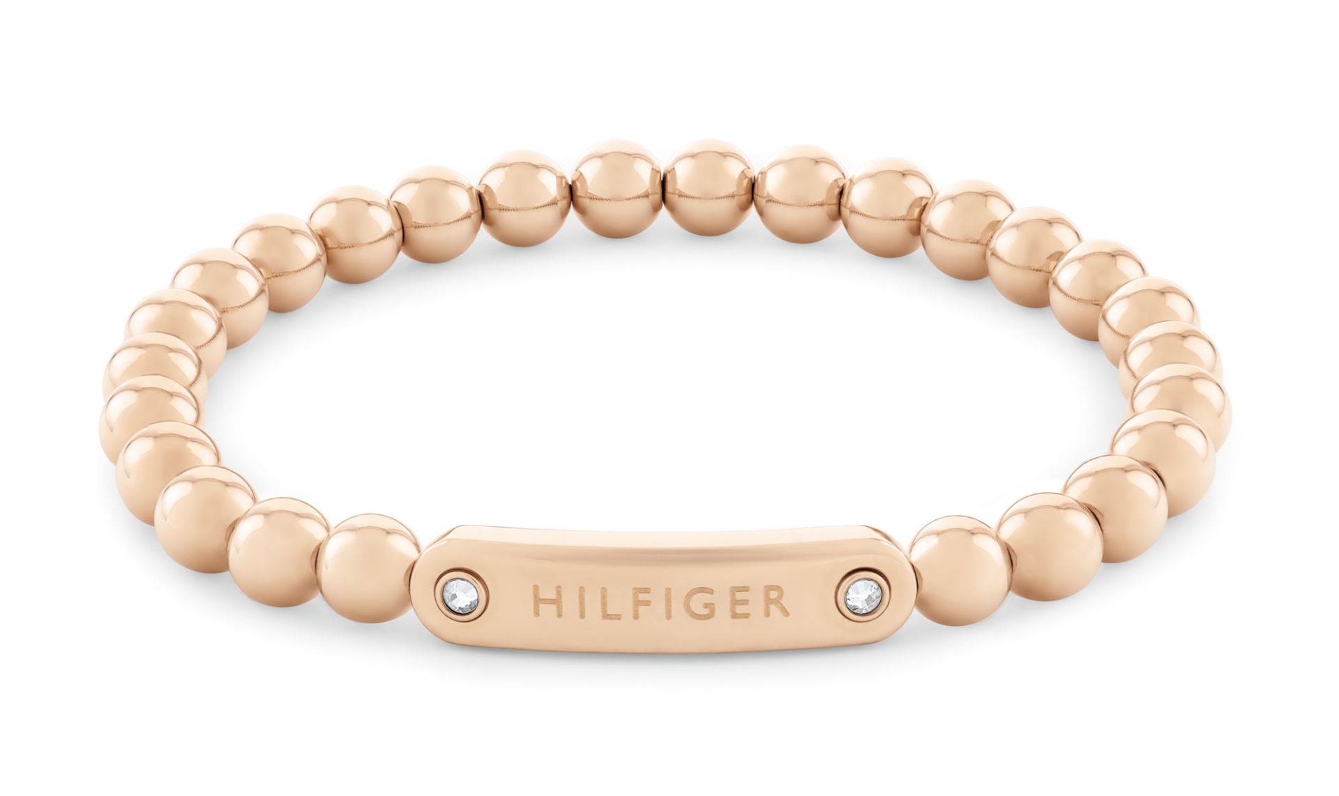 Slušivý korálkový náramek pro ženy od značky Tommy Hilfiger, vyrobený z velmi kvalitní oceli, upravený růžově zlatým PVD povlakem, složený z lesklých kulatých korálků, průměr korálků: 0,4 cm, ozdobu dekoruje nápis HILFIGER, doplněný o dva zirkony.