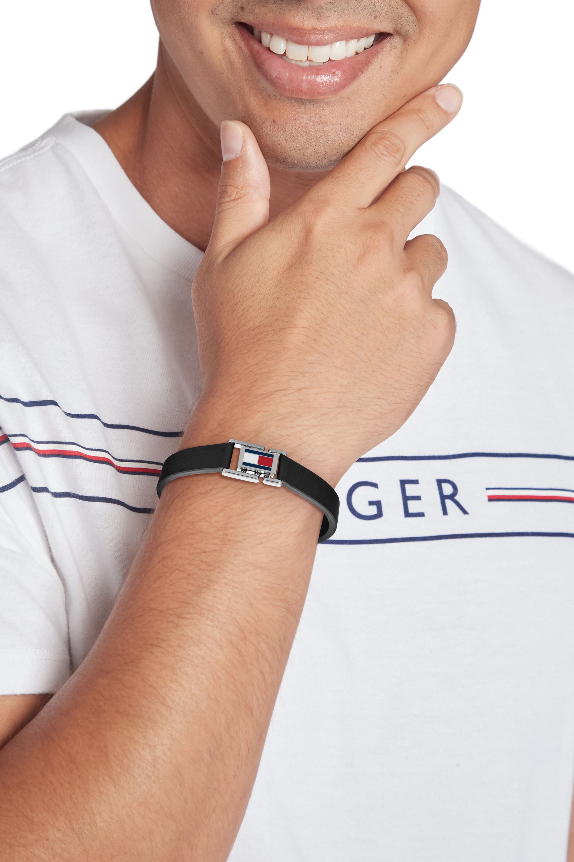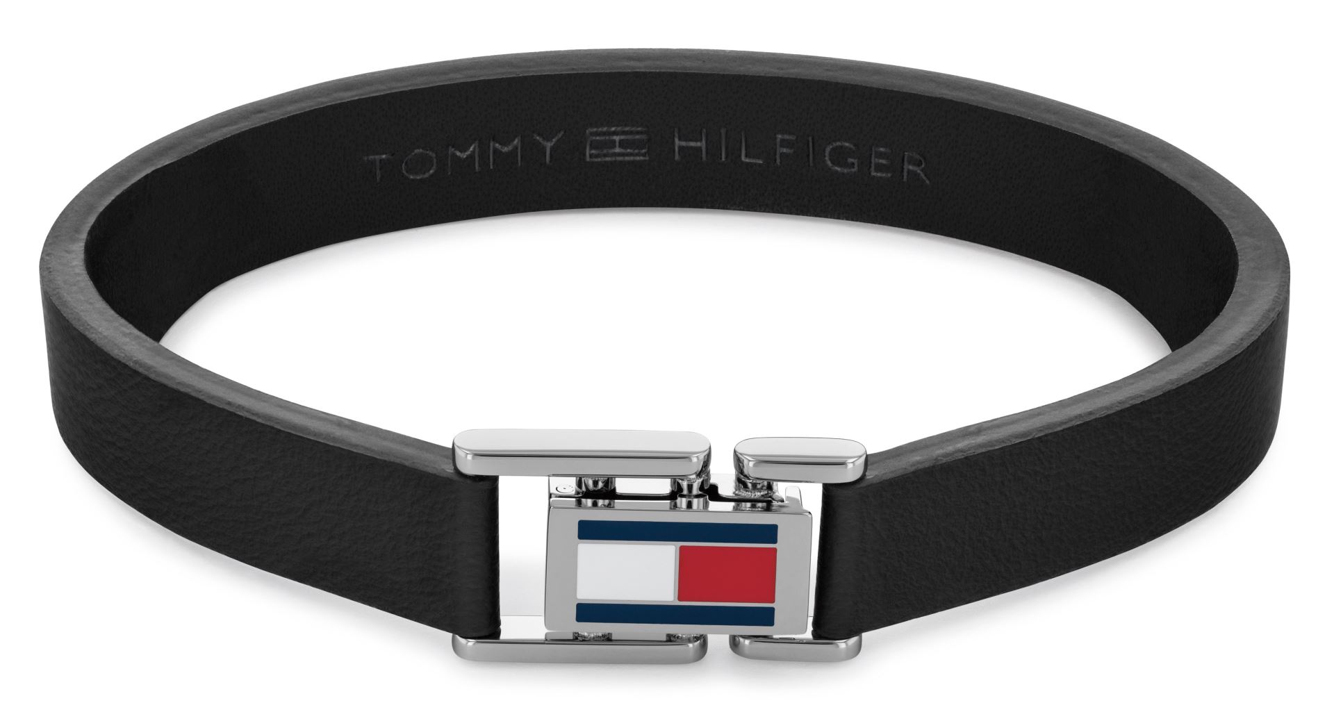 Černý náramek pro muže od značky Tommy Hilfiger, vyrobený z hladké kůže, zdobený moderním ocelovým zapínáním, délka náramku: 19 cm.