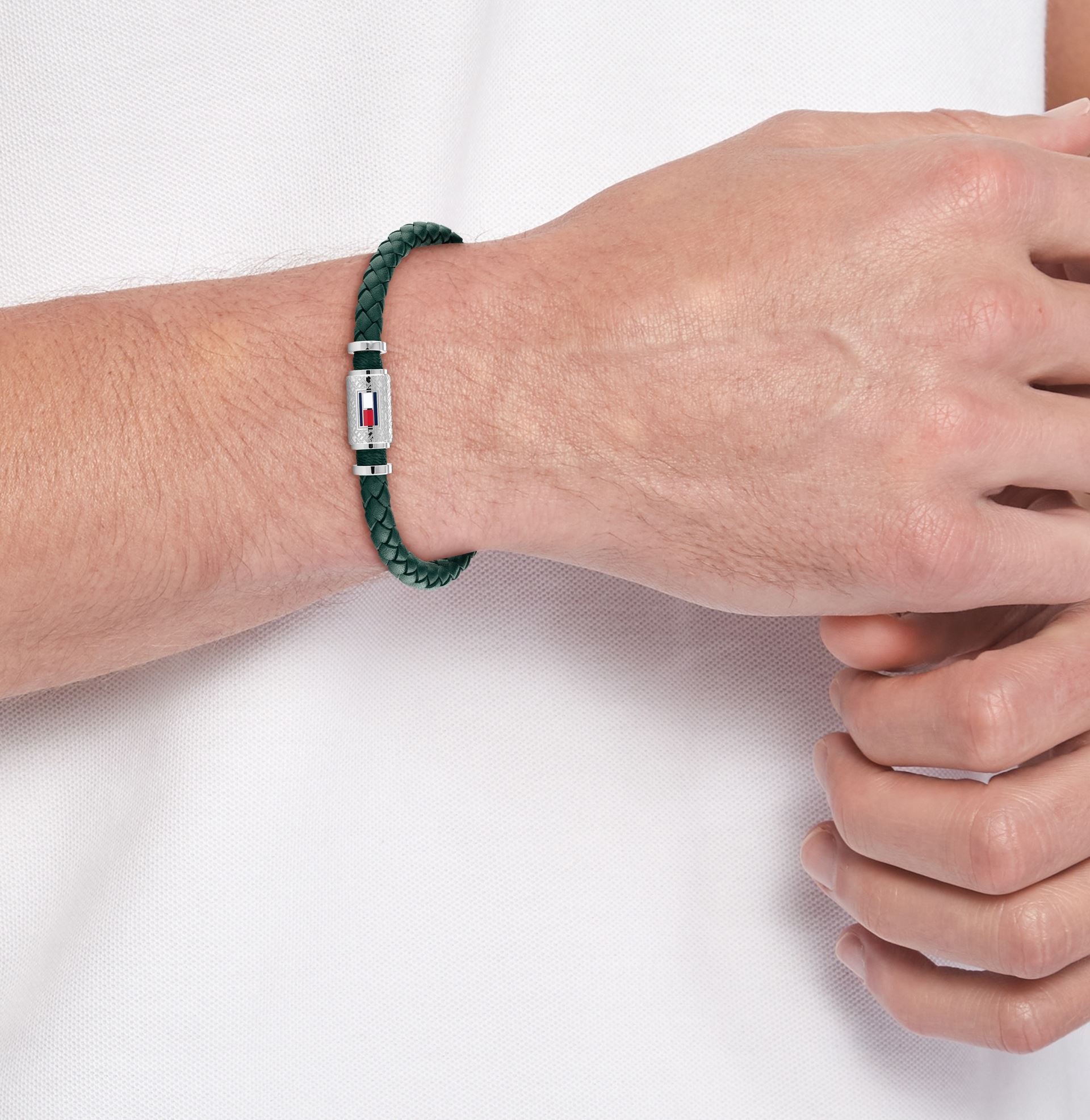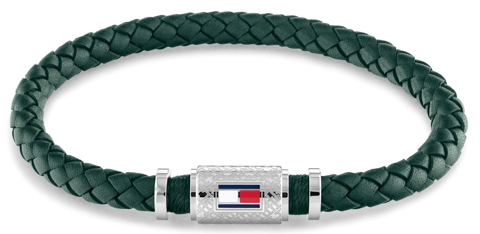 Moderní pánský náramek z dílny značky Tommy Hilfiger, jeho základ tvoří zelený kožený pásek, stylové propletení náramku vás na první pohled zaujme, délka náramku: 19 cm, zapínání na pevný magnet zabraňuje ztrátě, nechybí oblíbená tricolora značky.