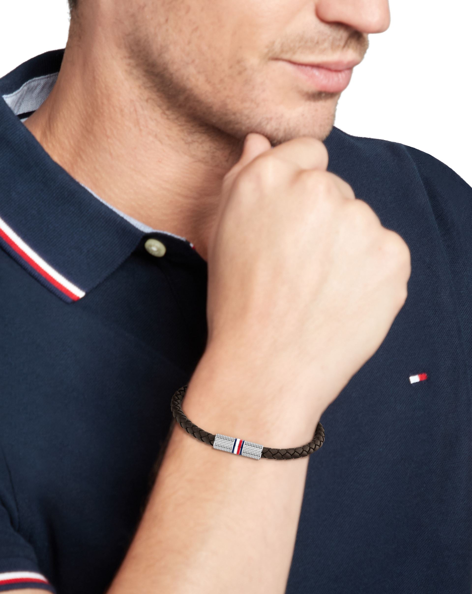 Moderní pánský náramek z dílny značky Tommy Hilfiger, jeho základ tvoří hnědý kožený pásek, zapínání na pevný magnet zabraňuje ztrátě, délka náramku: 19 cm, nechybí oblíbená tricolora značky.