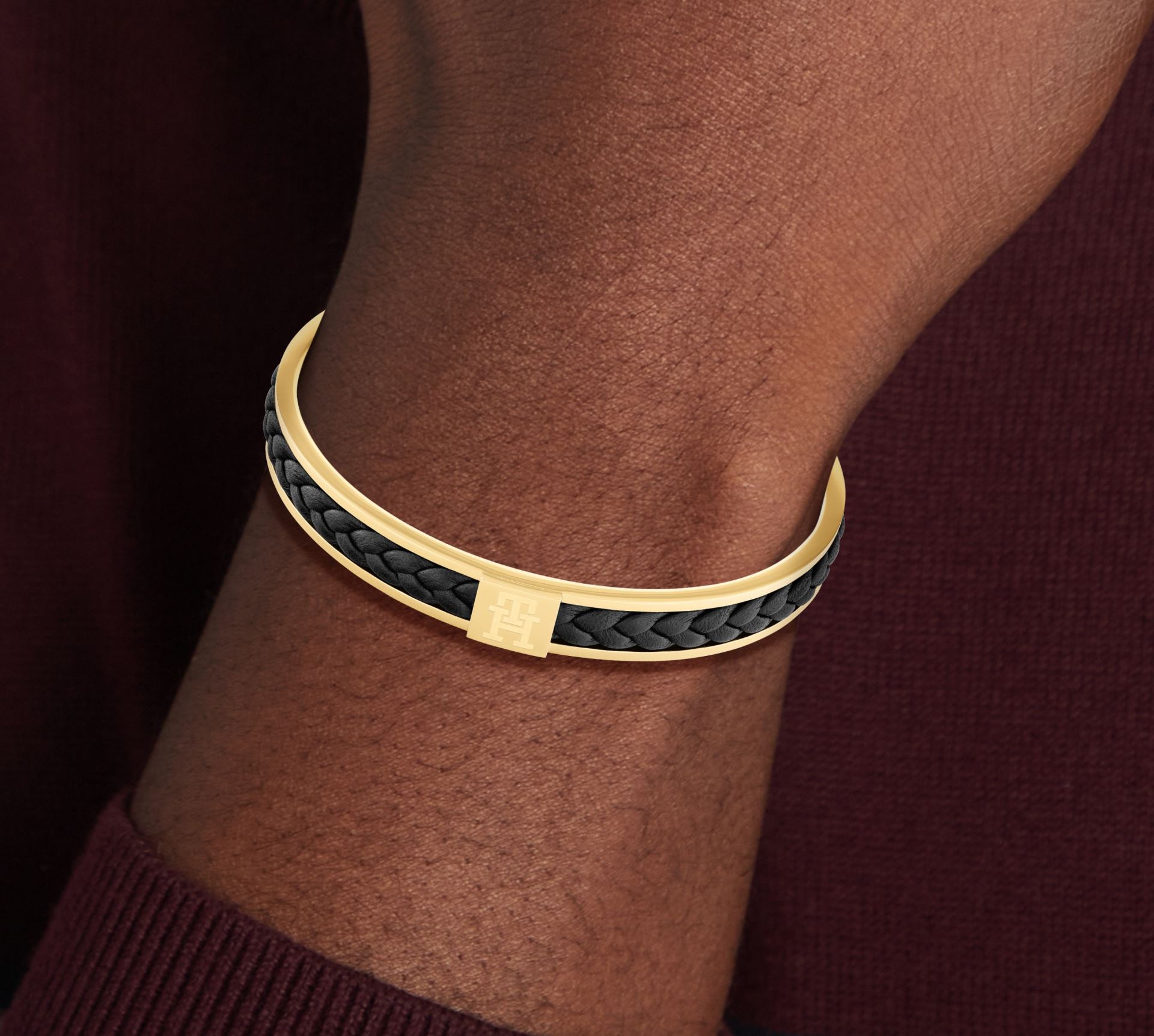 Stylový pánský náramek značky Tommy Hilfiger, vyroben z kvalitní oceli, pozlacen žlutým zlatem, na první pohled vás zaujme černý kožený detail v pleteném designu, střed náramku zdobí logo značky, skvěle doplní ležérní outfit, rozměr náramku: 6,5 x 5,5 x 3 cm.