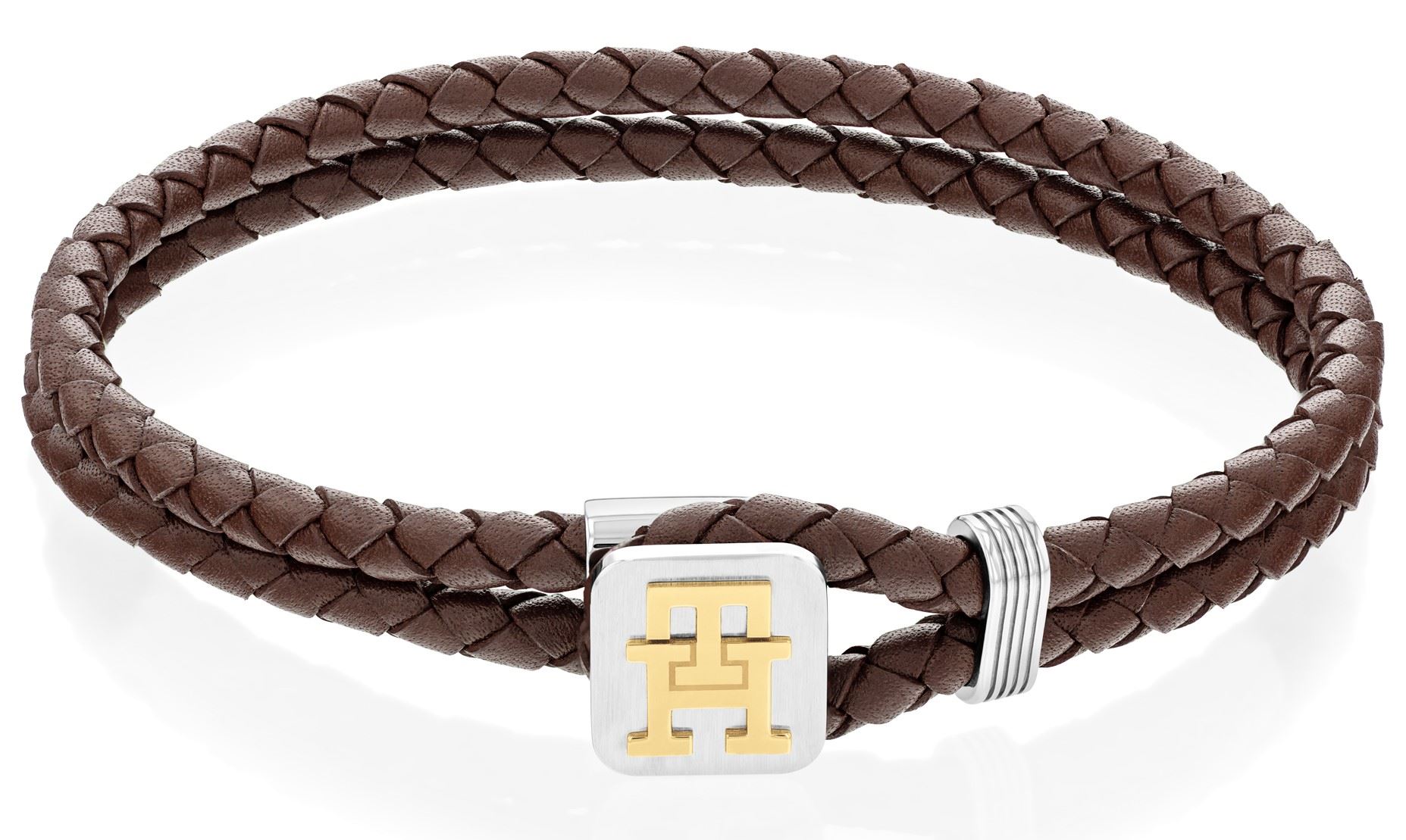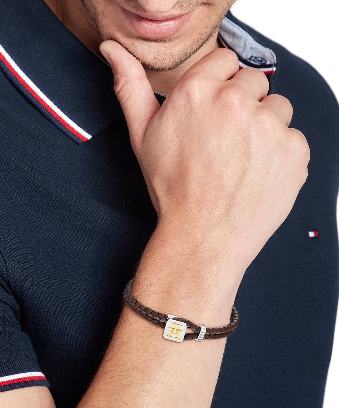 Moderní pánský náramek značky Tommy Hilfiger, vyrobený z efektně propletené hnědé kůže, zdobený netradičním zapínáním z oceli, nechybí uvedené iniciály značky, které jsou pozlacené žlutým zlatem, díky dvojitému provedení se příjemně nosí, délka náramku: 19 cm.