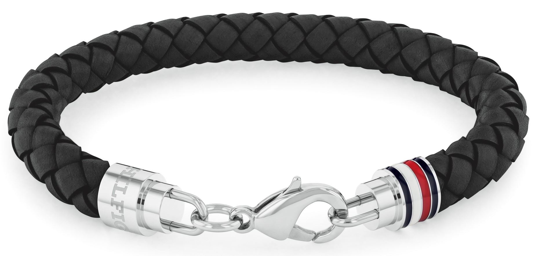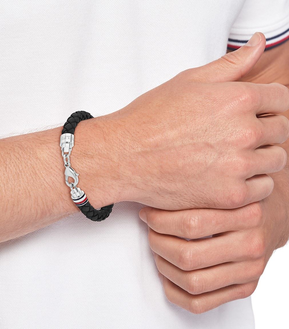 Módní pánský náramek značky Tommy Hilfiger, vyrobený z proplétané černé kůže a oceli, konec náramku dekoruje známá trikolora značky ze smaltu, zapínání na karabinku, délka náramku: 19 cm.