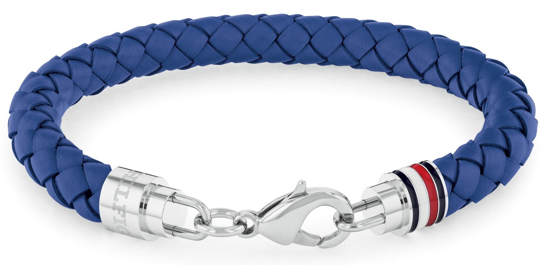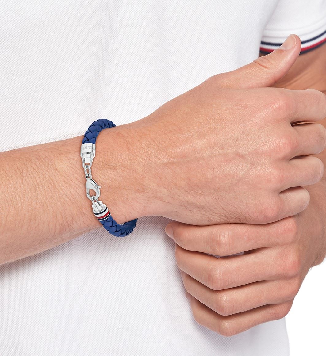 Módní pánský náramek značky Tommy Hilfiger, vyrobený z proplétané modré kůže a oceli, konec náramku dekoruje známá trikolora značky ze smaltu, zapínání na karabinku, délka náramku: 19 cm.