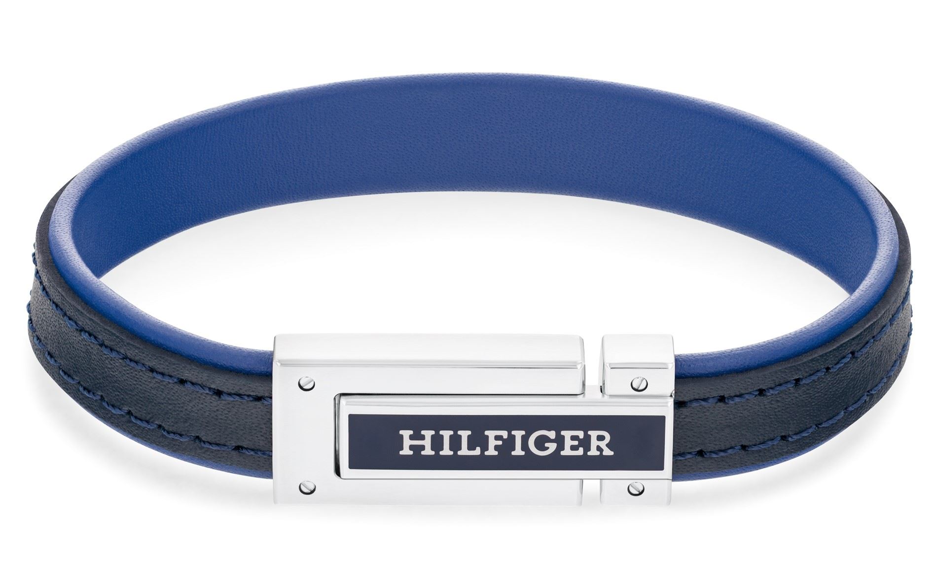 Modro-černý náramek pro muže od značky Tommy Hilfiger, vyrobený z hladké kůže, zdobený moderním ocelovým zapínáním, délka náramku: 19 cm.