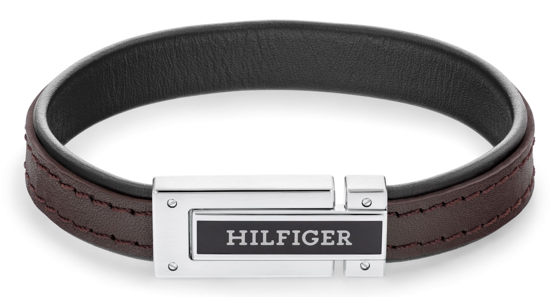 Hnědo-černý náramek pro muže od značky Tommy Hilfiger, vyrobený z hladké kůže, zdobený moderním ocelovým zapínáním, délka náramku: 19 cm.