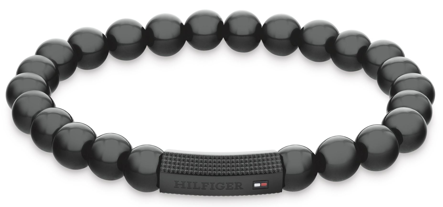 Korálkový náramek pro muže od značky Tommy Hilfiger, složen z černých korálků onyxu a oceli, ocelový korálek je ošetřen černým PVD povlakem, zdoben názvem a logem značky, délka náramku: 18 cm.