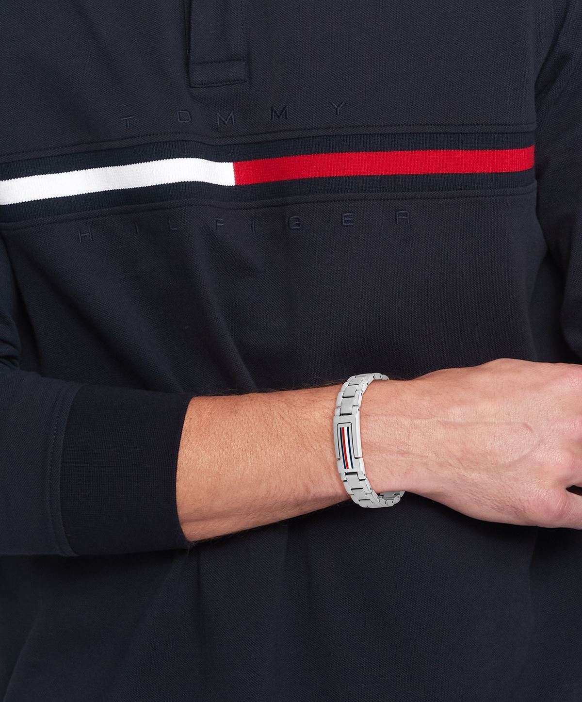 Módní pánský náramek od značky Tommy Hilfiger, vyrobený z kvalitní oceli, svým výrazným provedením každého na první pohled osloví, dekorovaný oblíbenou trikolorou, délka náramku: 19 cm, šířka náramku: 1,2 cm, zapínání na bezpečnostní sponu.