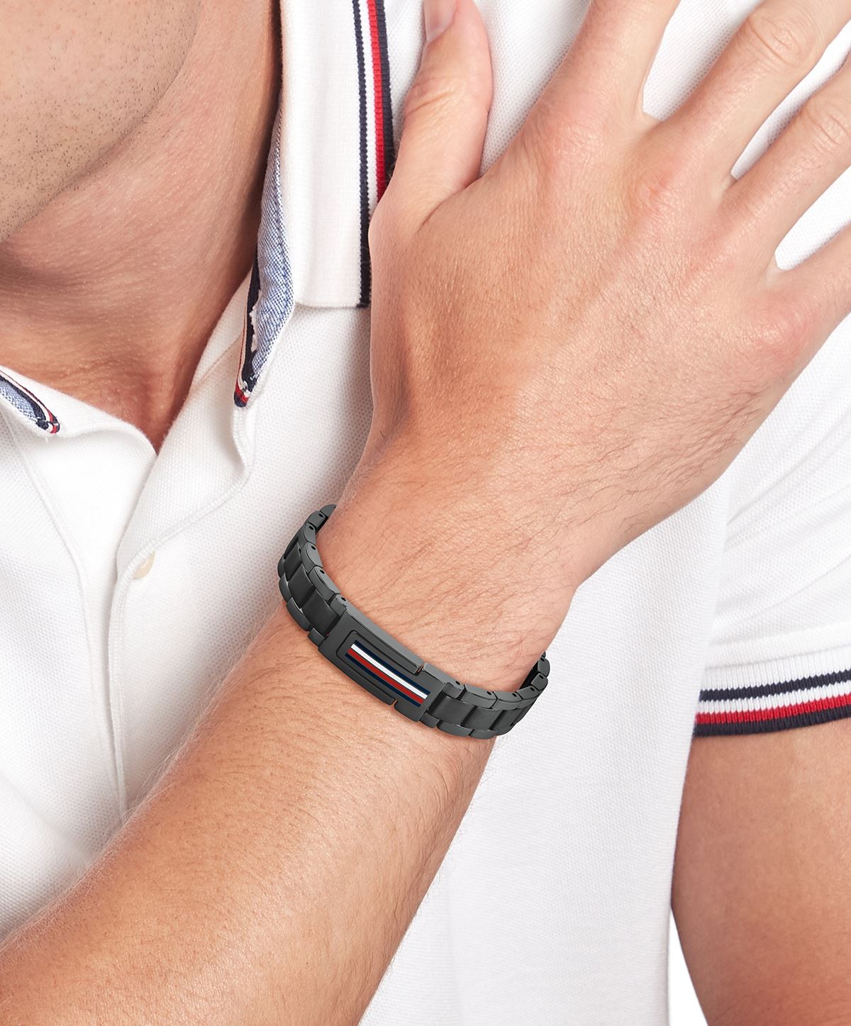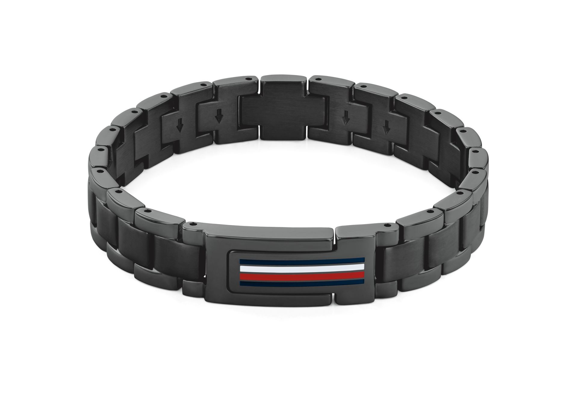 Módní pánský náramek od značky Tommy Hilfiger, vyrobený z kvalitní oceli, ošetřený černým PVD povlakem, svým výrazným provedením každého na první pohled osloví, dekorovaný oblíbenou trikolorou, délka náramku: 19 cm, šířka náramku: 1,2 cm, zapínání na bezpečnostní sponu.