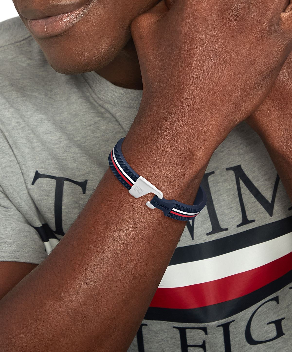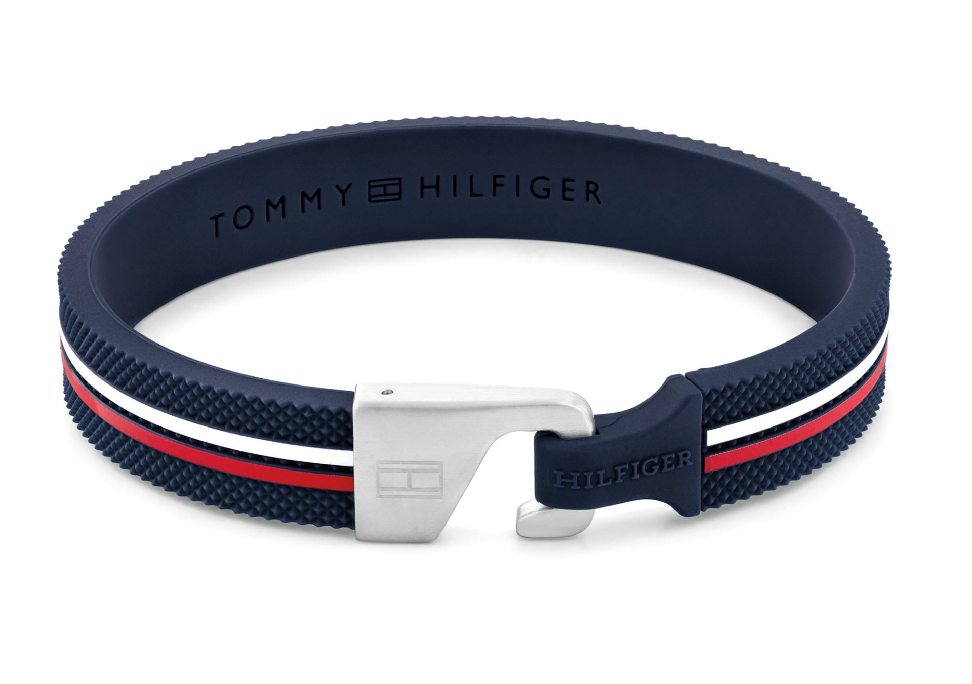 Fashion náramek pro muže od značky Tommy Hilfiger, vyrobený z tmavě modrého silikonu, doplněný známou tricolorou, ocelový háček zdobí logo značky, délka náramku: 19 cm.
