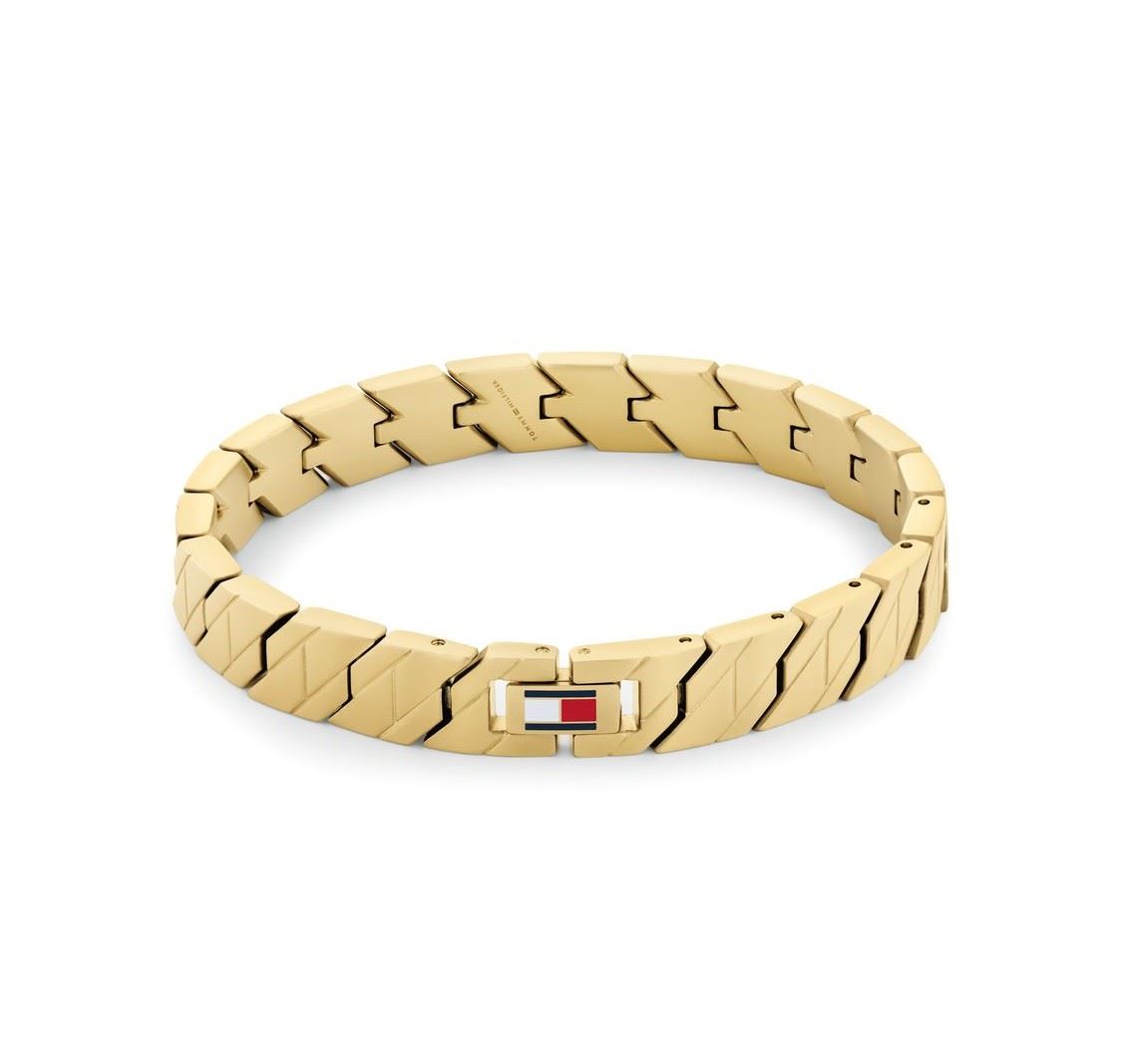Luxusní pánský náramek od značky Tommy Hilfiger, vyrobený z velmi kvalitní oceli, pokovený zlatým PVD povlakem, svým provedením každého na první pohled osloví, doplněný o logo značky, délka náramku: 19 cm, zapínání na sponu.