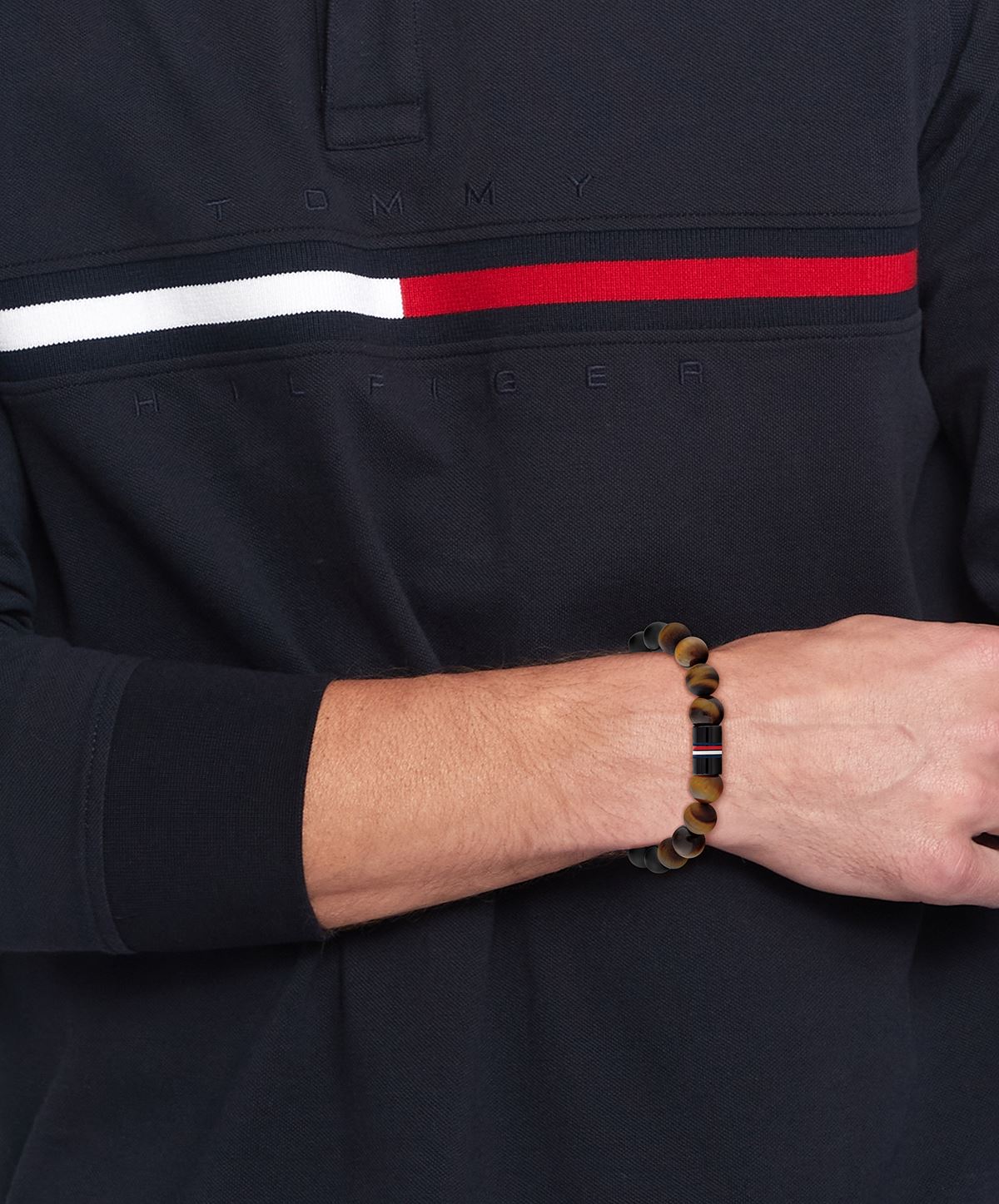 Stylový pánský náramek od značky Tommy Hilfiger, složený z korálků tygřího oka a onyxu, doplněný o korálek s ikonickou trikolorou značky, průměr korálků: 1 cm, délka náramku: 17,5 cm.