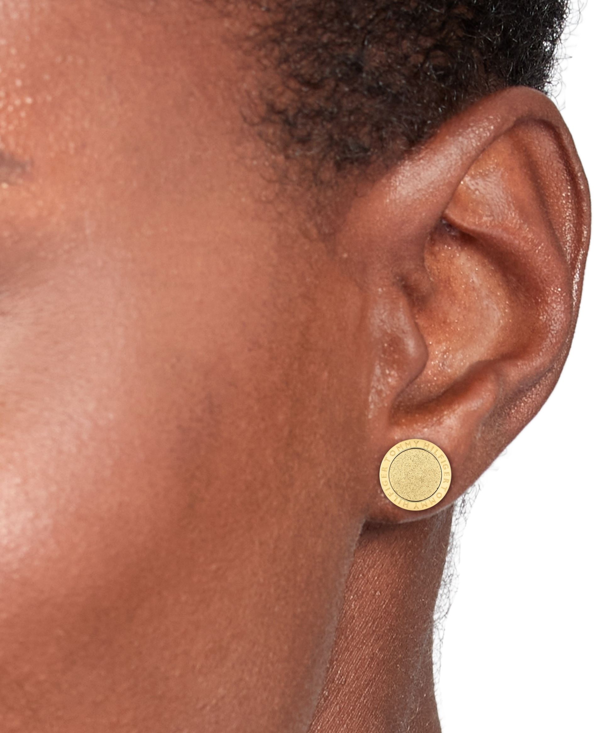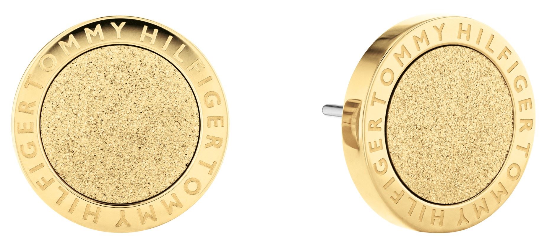 Nápadité dámské náušnice z dílny značky Tommy Hilfiger, vyrobené z kvalitní oceli, pozlacené žlutým zlatem, s designem klasických pecek, lemované názvem značky, na svém středu se oslnivě třpytí, průměr náušnic: 1,2 cm, zapínání na oblíbenou puzetku.