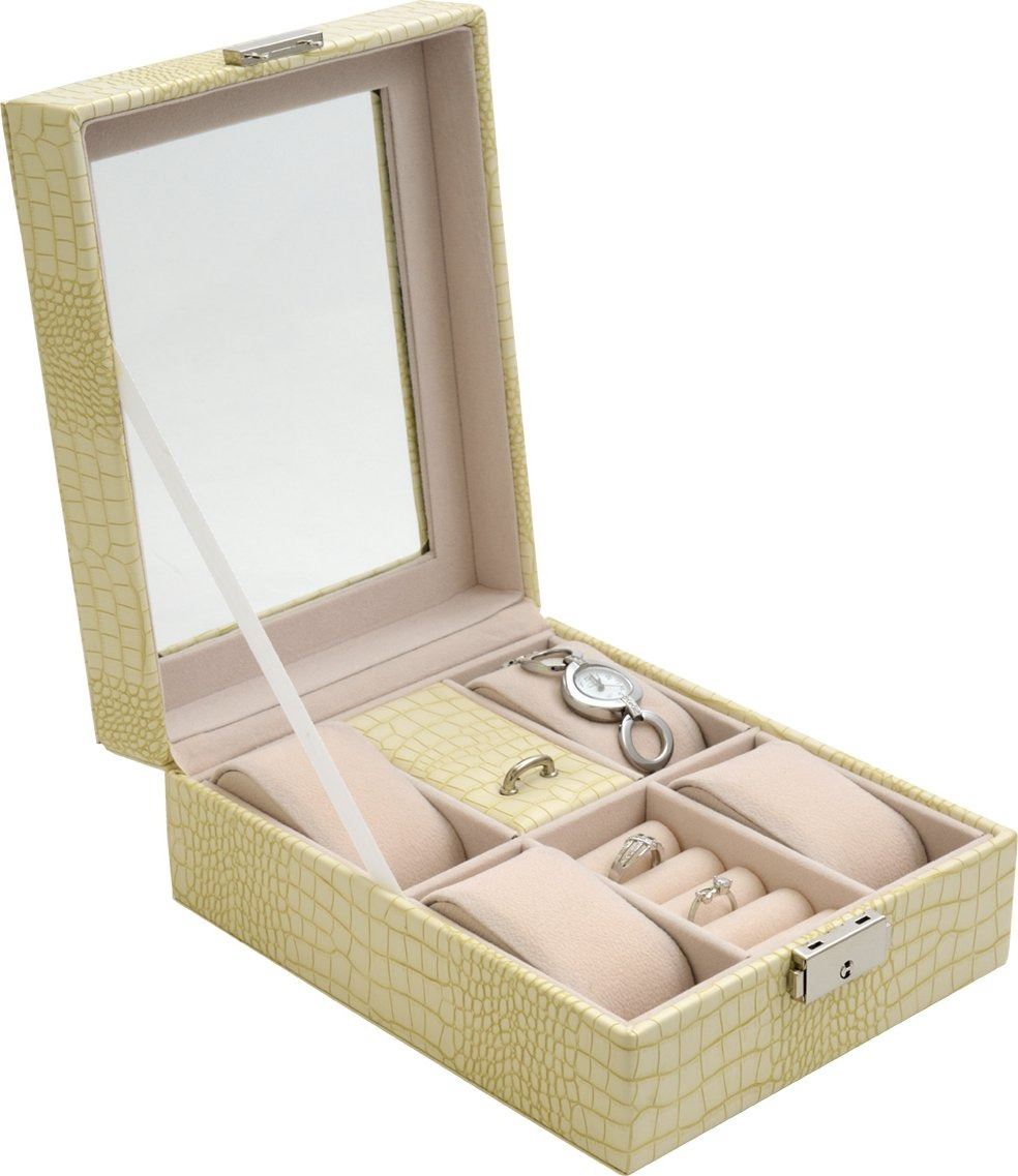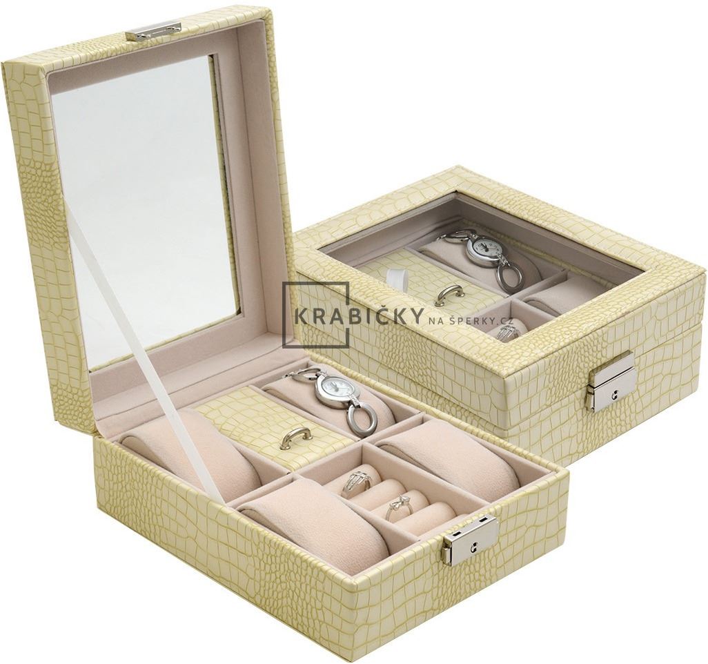 Praktická šperkovnice vyrobená ze syntetické kůže béžové barvy s úložnými boxy na čtvery hodinky nebo náramky, sloty na prsteny a přihrádkou na drobné šperky. Víko šperkovnice je prosklené a uzamykatelné.