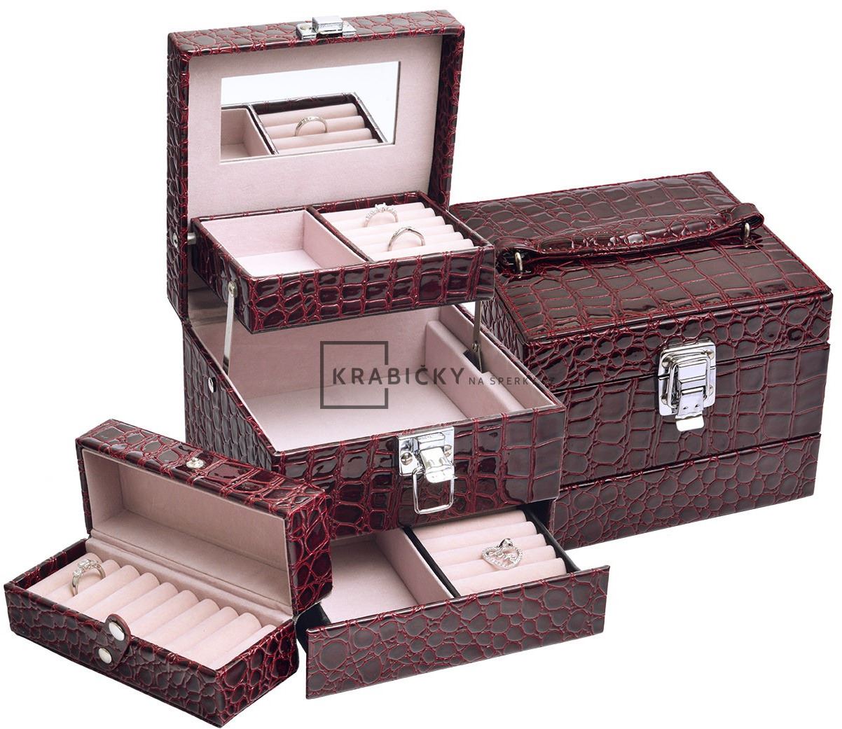 • Funkce a popis:Elegantní třípatrová šperkovnice vyrobená ze syntetické kůže bordó barvy. Součástí kazety je pak i malá cestovní šperkovnice. Na víku šperkovnice je připevněno praktické zrcátko a funkční zámek.