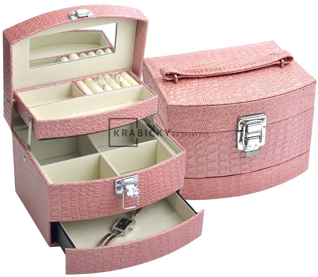 • Funkce a popis:Elegantní třípatrová šperkovnice vyrobená ze syntetické kůže růžové barvy. Na víku šperkovnice je připevněno praktické zrcátko a funkční zámek. Při otevření se automaticky otevře spodní šuplík a horní patro se zvedne.