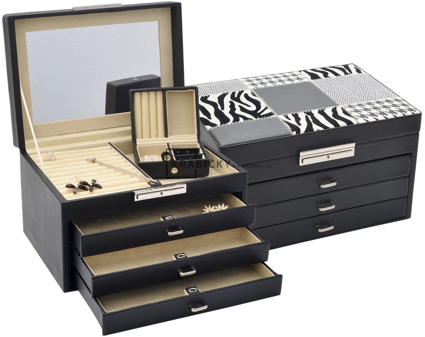Elegantní čtyřpatrová šperkovnice vyrobená ze syntetické kůže v kombinaci černé a bílé barvy. Součástí kazety je pak i malá cestovní šperkovnice. Na víku šperkovnice je připevněno praktické zrcátko a funkční zámek. Šuplíky jsou opatřeny kovovými úchytkami pro snadnou manipulaci.
