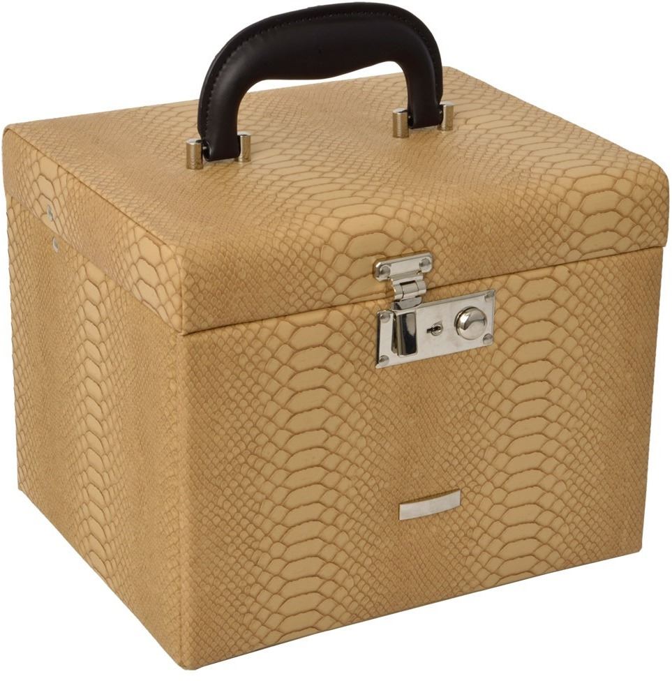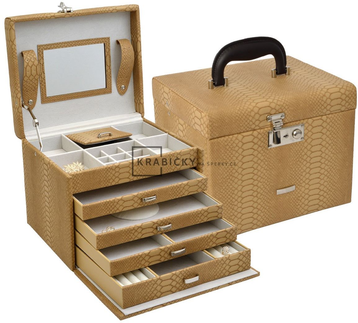 Elegantní pětipatrová šperkovnice vyrobená ze syntetické kůže krémové barvy. Na víku šperkovnice je připevněno praktické zrcátko a funkční zámek. Šuplíky jsou opatřeny kovovými úchytkami pro snadnou manipulaci.