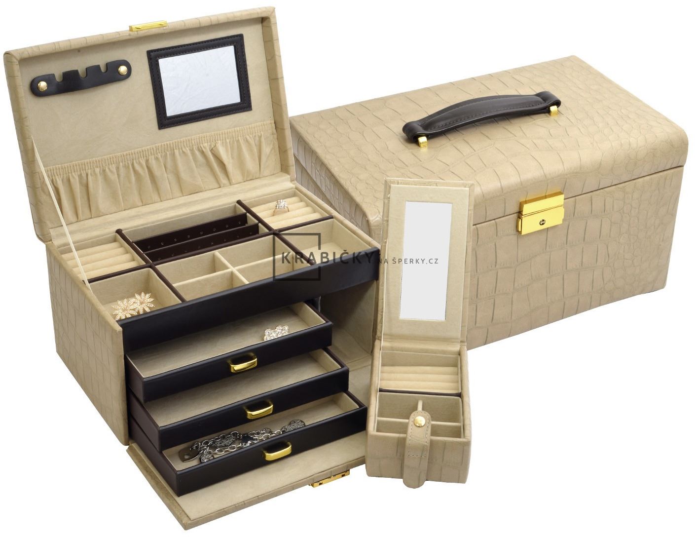 Elegantní čtyřpatrová šperkovnice vyrobená ze syntetické kůže béžové barvy. Součástí kazety je pak i malá cestovní šperkovnice. Na víku šperkovnice je připevněno praktické zrcátko a funkční zámek.