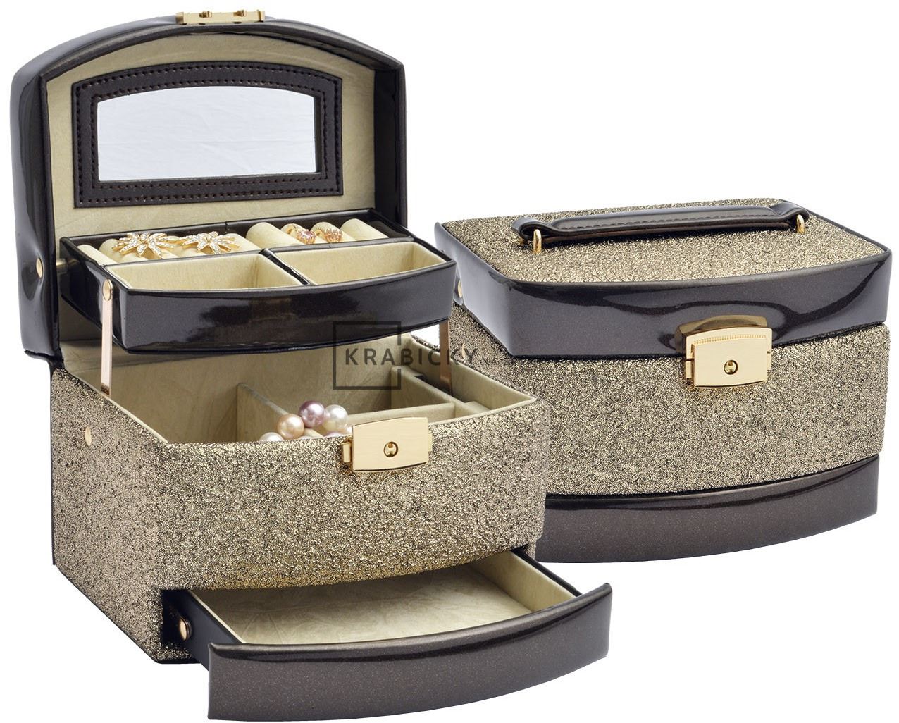 • Funkce a popis:Elegantní třípatrová šperkovnice vyrobená ze syntetické kůže zlatavé barvy s černými detaily. Automatické vysouvání spodního šuplíku. Na víku šperkovnice je připevněno praktické zrcátko a funkční zámek.