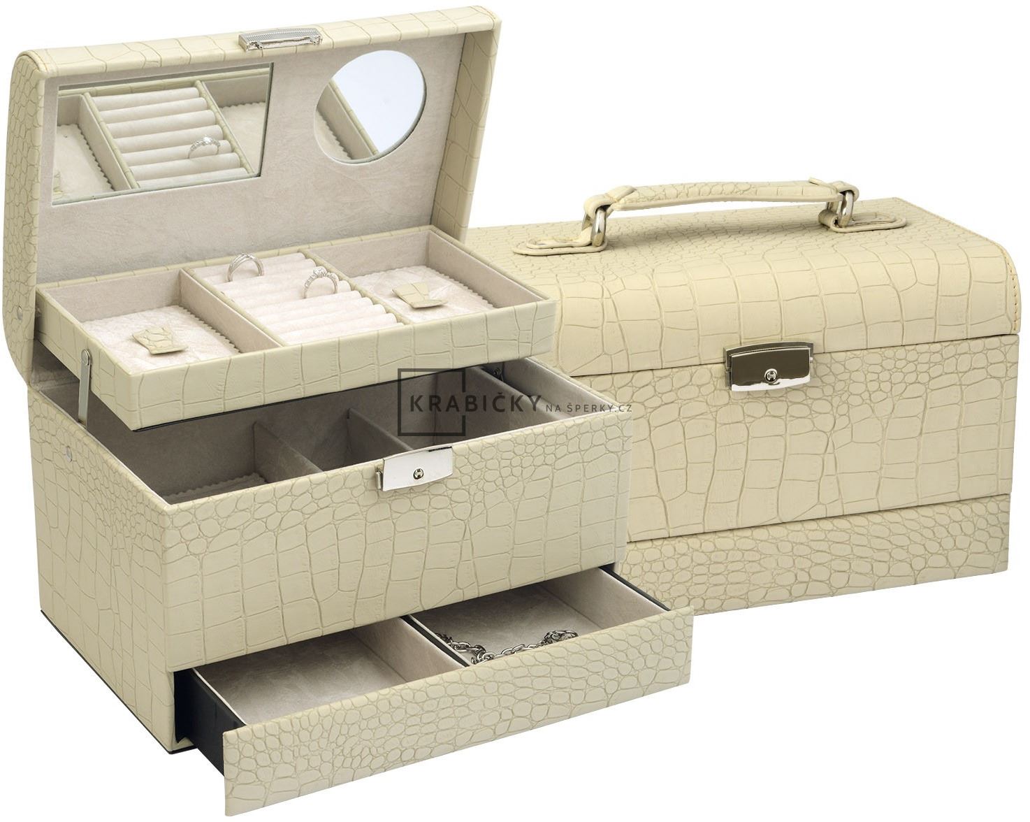 Elegantní třípatrová šperkovnice vyrobená ze syntetické kůže krémové barvy. Na víku šperkovnice jsou připevněna dvě praktické zrcátka a funkční zámek. Při otevření se automaticky otevře spodní šuplík a horní patro se zvedne.