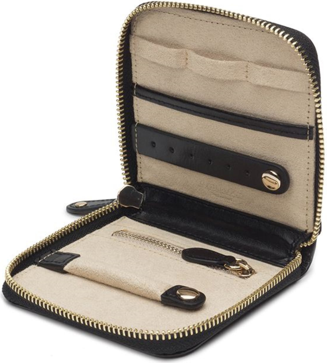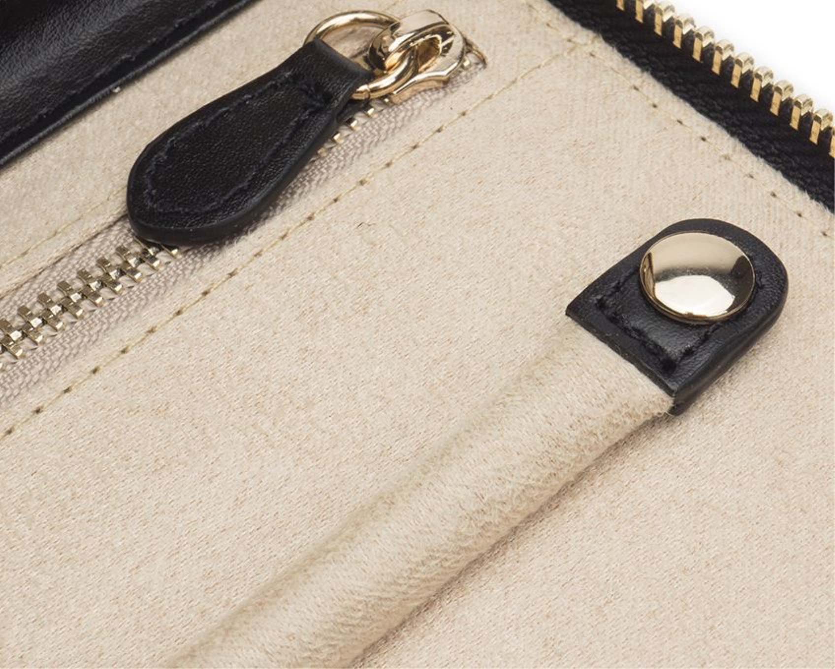 Cestovní pouzdro 308502 má složité cvočky na hladké kůži, hardware se zlatou povrchovou úpravou a patentovaný LusterLoc ™ od WOLF.