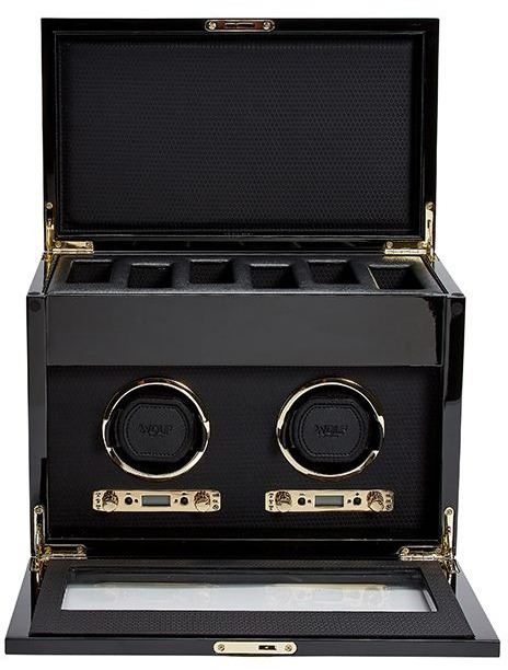 • Funkce a popis:Patentovaná inovace - Každý navíječ WOLF počítá přesný počet otáček. Všechny ostatní navíječe odhadují počet otáček Možnosti rotace: zpoždění startu 10 sekund. Lze nastavit mezi 300 a 1 200 TPD (otáčky za den). Zdvojnásobte množství TPD výběrem obousměrného nastavení Nastavení rezervy chodu: 6 až 72 hodin v krocích po 6 hodinách nastavení rezervy chodu pro přizpůsobení hodinek s rezervou chodu, což dává hodinám čas na uvolnění uložené energie před zahájením navíjení. Nastavení směru: ve směru hodinových ručiček, proti směru hodinových ručiček a obousměrný Manžeta: Patentovaná uzamykatelná manžeta „uzamkne“ vaše hodinky do bubnu rotátoru pro bezpečné uchycení. Pěna s nízkou hustotou pro všechny velikosti zápěstí, aniž byste vyvíjeli tlak na náramek. Možnost baterie: Možnost provozu jednotky na střídavé napájení (univerzální adaptér je součástí dodávky) nebo D-Cell / lithiové baterie (není součástí dodávky). Úložný prostor: 2 navíjecí modul, 6dílný úložný prostor pro hodinky (manžeta pojme až 52 mm pouzdro)