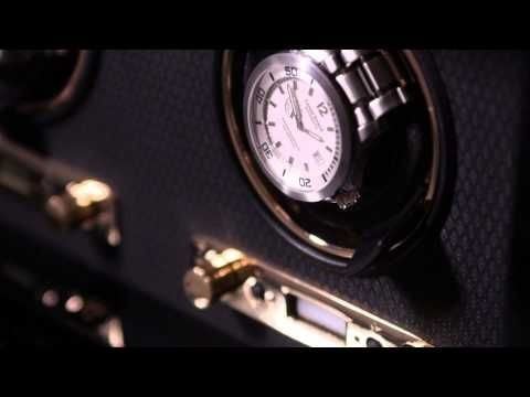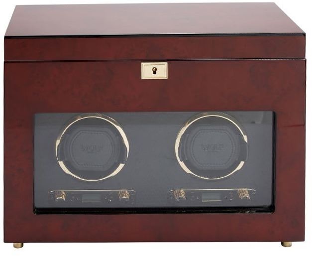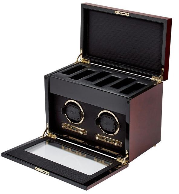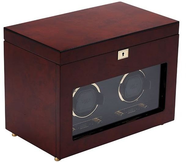 Natahovač hnědé leštěné barvy, pro 2 kusy mechanických hodinek s automatickým nátahem. Natahovač lze napájet zapomocí síťového adaptéru, který je součástí balení, nebo D-Cell / lithiové baterie (nejsou součástí dodávky). V horní části je prostor na uložení 6ks hodinek.