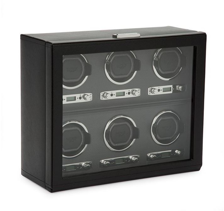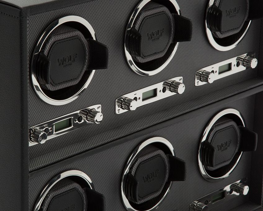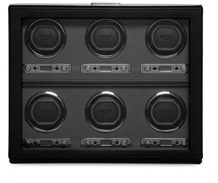 • Funkce a popis:Patentovaná inovace - Každý natahovač WOLF počítá přesný počet otáček. Všechny ostatní natahovače odhadují počet otáček Možnosti rotace: zpoždění startu 10 sekund. Lze nastavit mezi 300 a 1 200 TPD (otáčky za den). Zdvojnásobte množství TPD výběrem obousměrného nastavení Nastavení rezervy chodu: 6 až 72 hodin v krocích po 6 hodinách nastavení rezervy chodu pro přizpůsobení hodinek s rezervou chodu, což dává hodinám čas na uvolnění uložené energie před zahájením navíjení. Nastavení směru: ve směru hodinových ručiček, proti směru hodinových ručiček a obousměrný Manžeta: Patentovaná uzamykatelná manžeta „uzamkne“ vaše hodinky do bubnu rotátoru pro bezpečné uchycení. Pěna s nízkou hustotou pro všechny velikosti zápěstí, aniž byste vyvíjeli tlak na náramek. Možnost baterie: Běží pouze na střídavé napájení (je součástí univerzálního adaptéru). Skladování: 6 navíjecích modulů