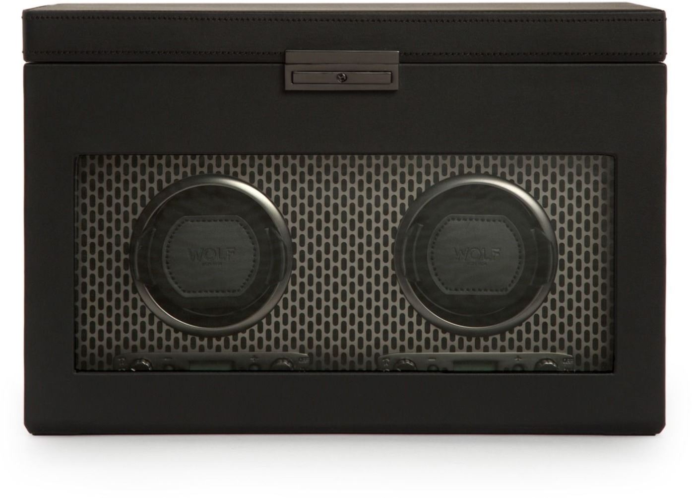 • Funkce a popis:Patentovaná inovace - Každý natahovač WOLF počítá přesný počet otáček. Všechny ostatní navíječe odhadují počet otáček Možnosti rotace: zpoždění startu 10 sekund. Lze nastavit mezi 300 a 1 200 TPD (otáčky za den). Zdvojnásobte množství TPD výběrem obousměrného nastavení Nastavení rezervy chodu: 6 až 72 hodin v krocích po 6 hodinách nastavení rezervy chodu pro přizpůsobení hodinek s rezervou chodu, což dává hodinám čas na uvolnění uložené energie před zahájením navíjení. Nastavení směru: ve směru hodinových ručiček, proti směru hodinových ručiček a obousměrný Baterie: Možnost provozu na střídavé napájení (univerzální adaptér je součástí dodávky) nebo D-Cell / lithiové baterie (není součástí dodávky) Manžeta: Patentovaná uzamykatelná manžeta „uzamkne“ vaše hodinky do bubnu rotátoru pro bezpečné uchycení. Pěna s nízkou hustotou pro všechny velikosti zápěstí, aniž byste vyvíjeli tlak na náramek. Úložiště: 2 navíjecí moduly, 1 kus úložného prostoru pro hodinky (manžeta pojme až 52 mm pouzdro) a cestovní pouzdro