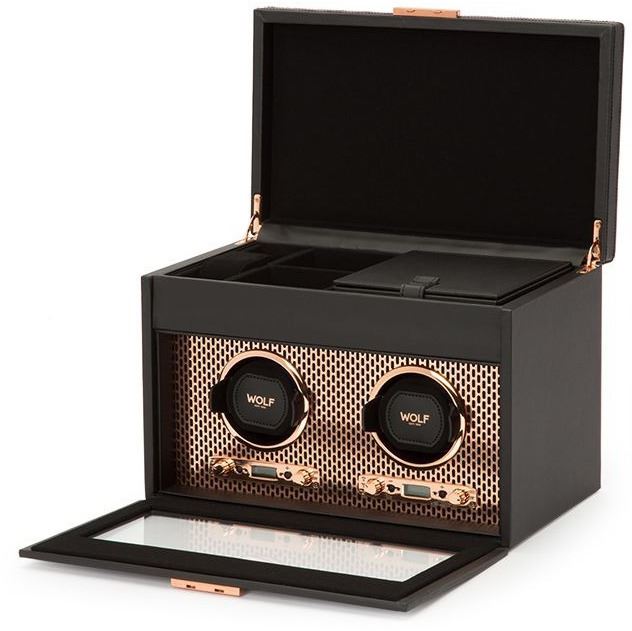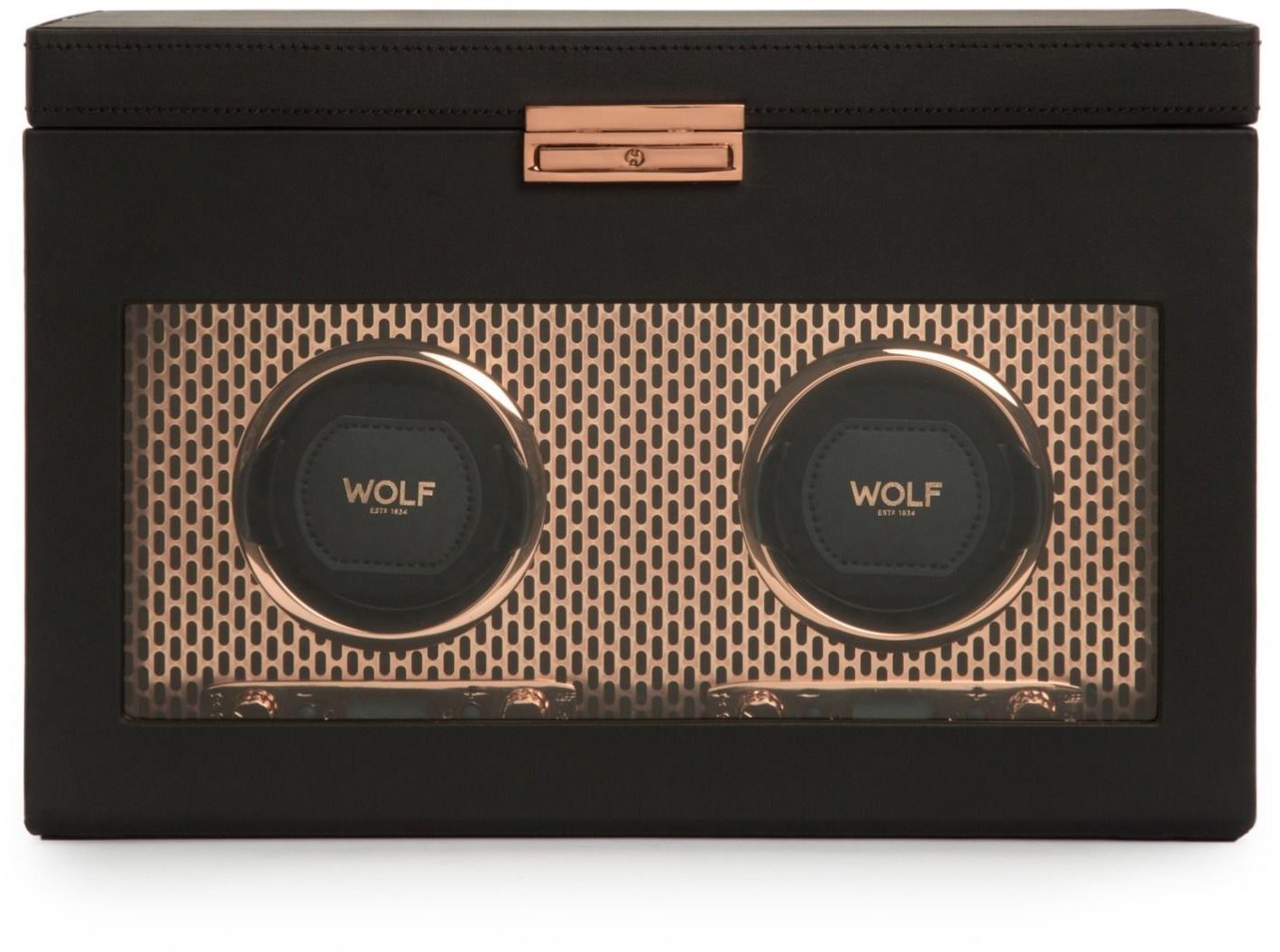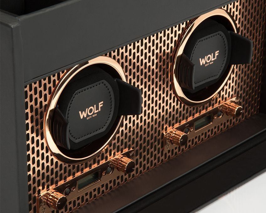 Měděně pokovená děrovaná ocel laserem řezaná s čistými, elegantními liniemi. Natahovač AXIS pohání moderní a odvážný vzhled pro úschovu vašich hodinek. Zahrnuje vlastní pokovení, vnitřek z mikrovlákna, uzamykatelný skleněný kryt, podsvícený LCD displej, hardware s měděným povrchem, 1 úložiště hodinek se zvýšenou manžetou, 2 střední oddíly, cestovní pouzdro a 2 navíjecí moduly.
