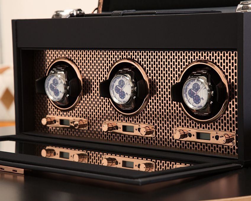Práškově měděně pokovená děrovaná ocel laserem řezaná s čistými, elegantními liniemi. AXIS pohání moderní a odvážný vzhled pro úschovu vašich hodinek. Zahrnuje vlastní pokovení, vnitřek z mikrovlákna, uzamykatelný skleněný kryt, podsvícený LCD displej, hardware s práškovým nebo měděným povrchem, 2 úložné prostory pro hodinky se zvýšenou manžetou, 4 střední přihrádky, cestovní pouzdro a 3 navíjecí moduly.