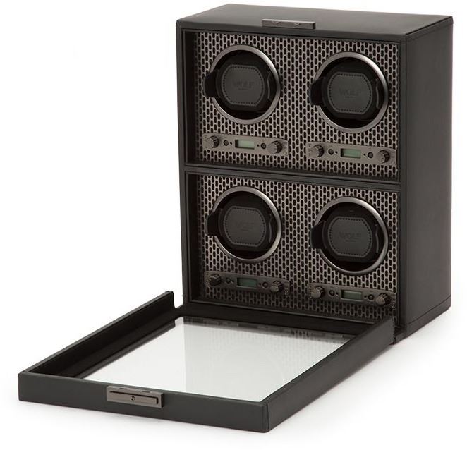 Práškově lakovaná pokovená laserem řezaná perforovaná ocel tavená s čistými, elegantními liniemi. AXIS pohání moderní a odvážný vzhled pro úschovu vašich hodinek. Zahrnuje vlastní pokovení, vnitřek z mikrovlákna, uzamykatelný skleněný kryt, podsvícený LCD displej, hardware s práškovým povrchem a 4 navíjecí moduly.