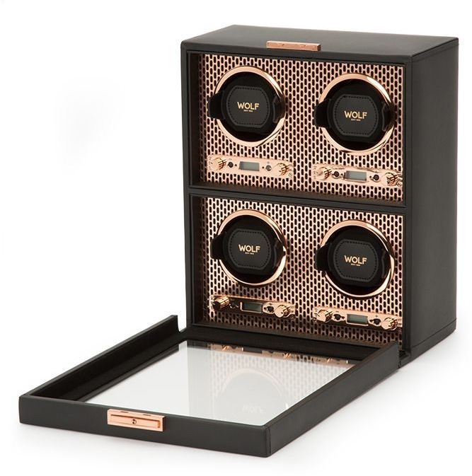 Práškově měděně pokovená laserem řezaná perforovaná ocel tavená s čistými, elegantními liniemi. AXIS pohání moderní a odvážný vzhled pro úschovu vašich hodinek. Zahrnuje vlastní pokovení, vnitřek z mikrovlákna, uzamykatelný skleněný kryt, podsvícený LCD displej, hardware s měděným povrchem a 4 navíjecí moduly.