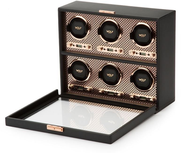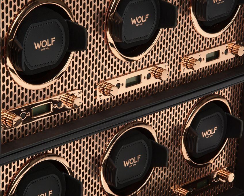 Laserem broušená děrovaná ocel potažená mědí se spojila s čistými, elegantními liniemi. AXIS pohání moderní a odvážný vzhled pro úschovu vašich hodinek. Důvěryhodná patentovaná technologie počítání rotací osy vašich hodinek zaručuje přesné zatáčky za den. Odvážný luxus, bezchybný design, vezměte AXIS na otočku. Obsahuje uzamykatelný skleněný kryt, podsvícený LCD displej, hardware potažený mědí a 6 navíjecích modulů.